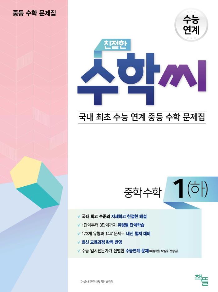 중등수학 친절한 수학씨 시리즈는 최신 교육과정을 완벽 반영하였으며, 유형을 세분화하여 분류하고, 유형에 따른 단계별 문제를 꼭 필요한 단계만을 선별하여 수록하였습니다. 따라서 1단계가 없는 유형, 3단계가 없는 유형이 있습니다. 유형이 너무 쉬워서 3단계 문제가 나올 수 없을 때는 3단계 문제가 없고, 기본적으로 유형이 어렵다면 가장 쉬운 1단계 문제가 없습니다. 꼭 필요한 단계만을 선별하여 수록하였으므로 학생들이 쓸데 없는 문제를 푸느라 시간을 낭비하지 않습니다.